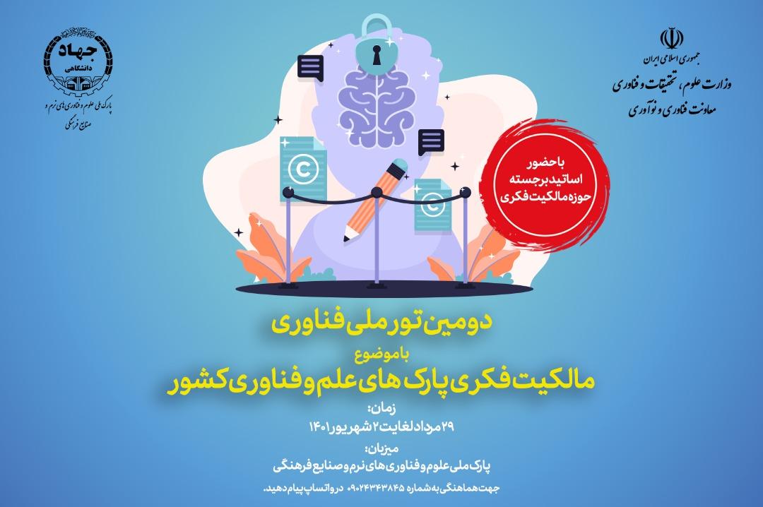 دومین برنامه تور ملی فناوری مالکیت فکری ویژه پارک های علم و فناوری کشور توسط معاونت فناوری و نوآوری وزارت علوم ،29 مرداد لغایت 2 شهریور 1401 در محل پارک ملی علوم و فناوری های نرم و صنایع فرهنگی برگزار می گردد.