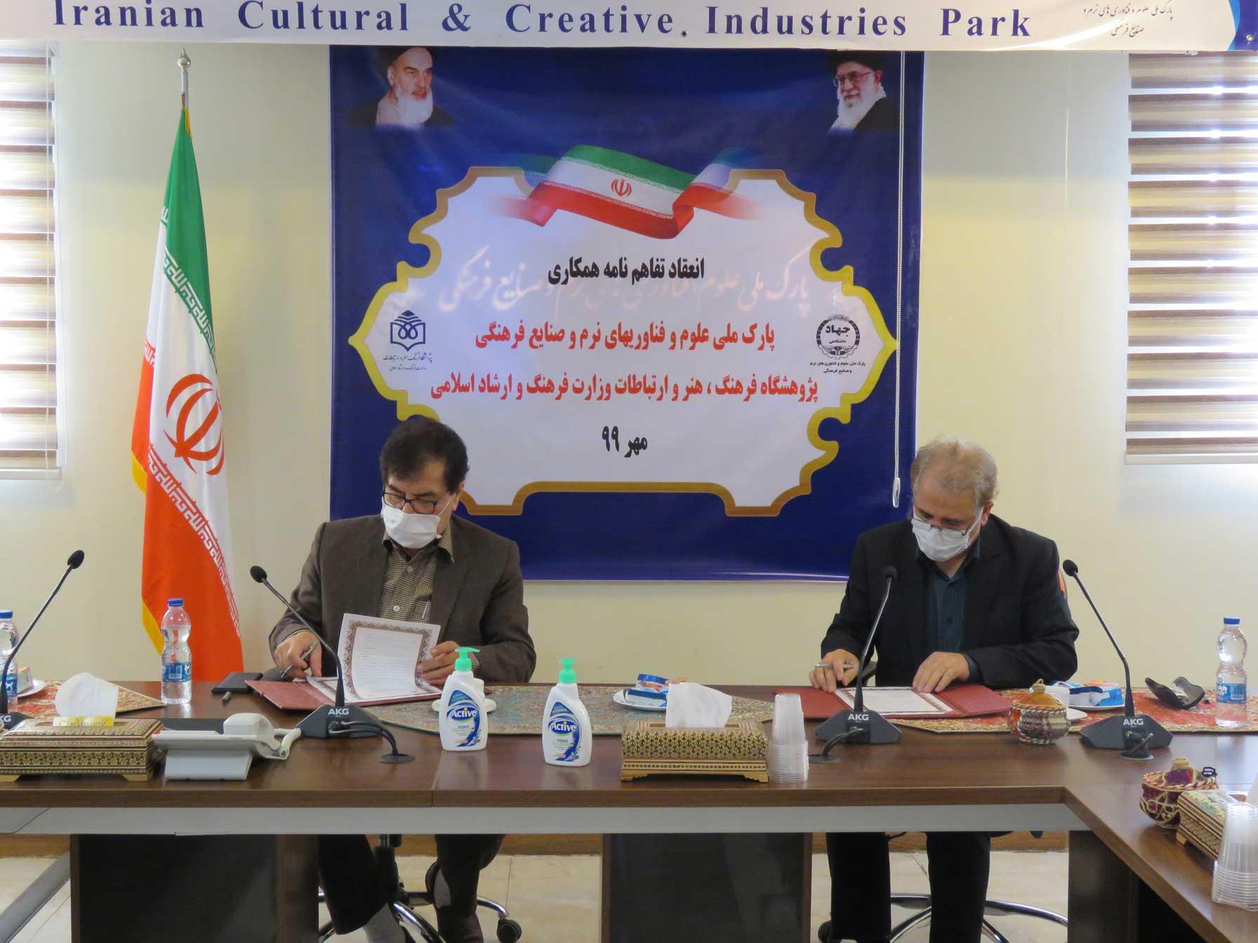 مراسم امضای تفاهم نامه همکاری دو جانبه بین پارک ملی علوم، فناوری های نرم و صنایع فرهنگی و پژوهشگاه فرهنگ، هنر و ارتباطات به منظور توسعه فعالیت های پژوهشی در حوزه صنایع فرهنگی با افزایش فعالیت های مشترک و بهره گیری از ظرفیت های علمی، تحقیقاتی، آموزشی و کاربردی متقابل برگزار شد.