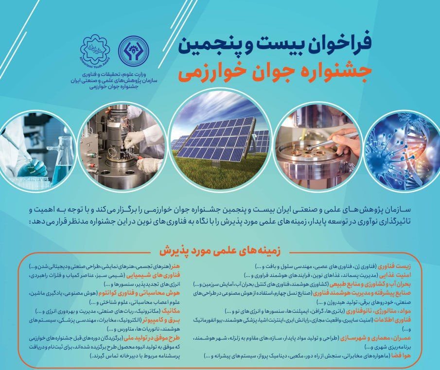 سازمان پژوهشهای علمی و صنعتی ایران بیست و پنجمین جشنواره جوان خوارزمی را که با سالها برگزاری مستمر به عنوان مهمترین رخداد علمی و فناوری برای جوانان کشور شناخته شده است، برگزار میکند.