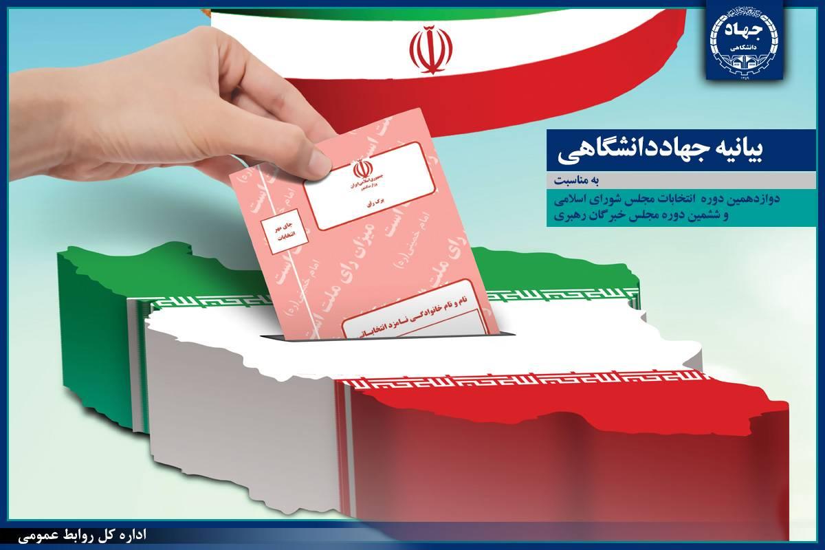 نهاد انقلابی جهاددانشگاهی از زمان تشکیل، همواره در کنار مردم و در خط مقدمِ دفاع از آرمانهای انقلاب بوده است. این نهاد هماکنون و در آستانه ششمین دوره انتخابات مجلس خبرگان رهبری و دوازدهمین دوره مجلس شورای اسلامی نیز همچون گذشته، با تعهد به رسالت خود تاکید دارد باوجود همه مشکلات اقتصادی و معیشتی، پویایی، آبادانی و آینده روشن کشور در گروی انتخابی هوشمندانه و ورود افکار جدید به نظام تصمیمگیری است.