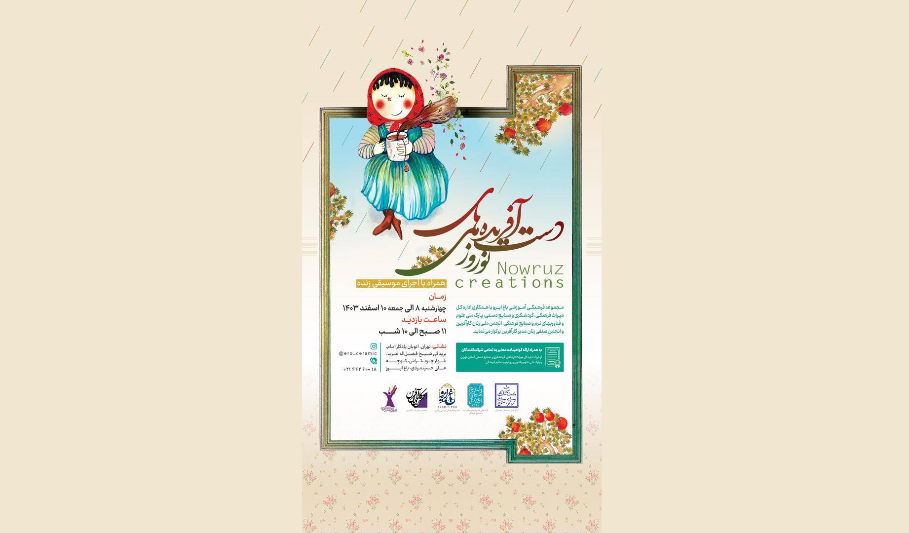 نمایشگاه دستآفریدهای نوروزی به منظور نمایش داشتههای فرهنگی نوروز باستانی به همت مجموعه فرهنگی و گردشگردی باغ ایرو، با مدیریت اجرایی معصومه حسین مردی موسس و مدیر این مجموعه فرهنگی برگزار شد. به گزارش روابط عمومی پارک ملی علوم و فناوری های نرم و صنایع فرهنگی در نمایشگاه دستآفریدهای نوروزی هنرمندان شناخته شده صنایع دستی از قومیتهای مختلف چون کرد، لر، بلوچ، گیلان، مازندران، خراسان و دیگر اقوام حضور داشتند و با عرضه صنایع دستی بخش مهمی از تاریخ هنر صنایع دستی را در معرض نمایش گذاشتند. در این نمایشگاه صنایع دستی، هنرهایی همچون سفال، سوزندوزی، عروسک بافی، پوشاک، زیورآلات و شیرینیهای نوروزی مخصوص مناطق مختلف عرضه شد و مخاطبان به خصوص دانشجویان رشته گردشگری و صنایع دستی برای دیدن و آشنا شدن با صاحبان این صنایع در نمایشگاه دستآفریدهای نوروزی حضور داشتند.