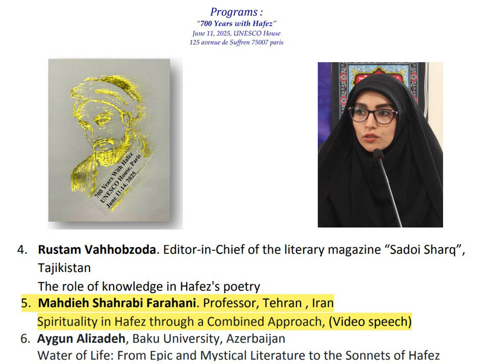 این همایش 21 خرداد ماه با حضور اندیشمندان و پژوهشگرانی از کشورهای مختلف جهان در مقر یونسکو در شهر پاریس برگزار شد و در آن آثار مرتبط با حافظ به نمایش گذاشته شد و دکتر مهدیه شهرابی به صورت آنلاین با موضوع «مفهوم معنویت از دیدگاه حافظ با تاکید بر رویکرد تلفیقی» سخنرانی کرد.
