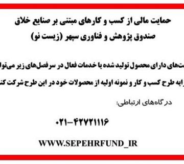 حمایت مالی از کسب و کارهای مبتنی بر صنایع خلاق(صندوق پژوهش و فناوری سپهر (زیست نو))مدیر پارک14 اردیبهشت 1399با توجه به شیوع بیماری کرونا و به منظور تسهیل در فعالیت شرکت ها ، صندوق پژوهش و فناوری سپهر ... ادامه مطلب